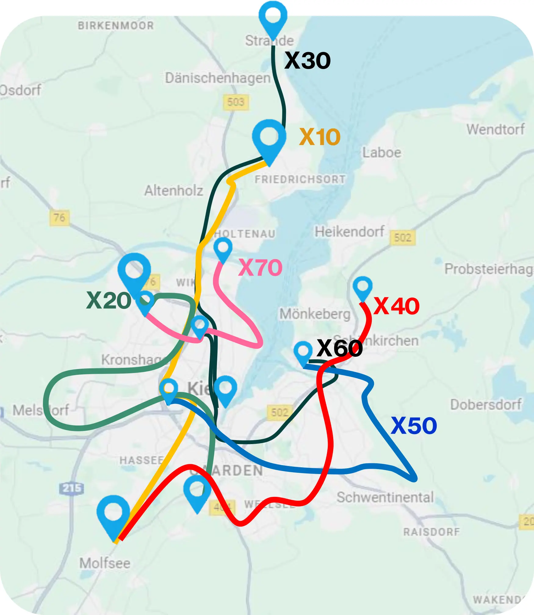 Auch die Linien X70, X40, X10 und X50 sind völlig am Bedarf vorbeigeplant. Die einzig sinnvollen Linien X30 und X60 gibt es entweder schon oder sie sind in Planung.